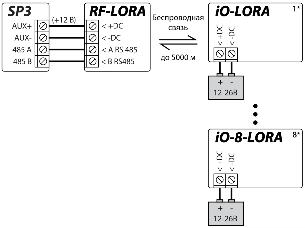 - К охранной панели "FLEXi" SP3 трансивер RF-LORA подключается через шину RS485.