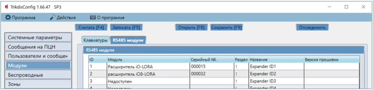 В списке "Модули" выберите "Расширитель iO-LORA" ("Расширитель iO-8-LORA").