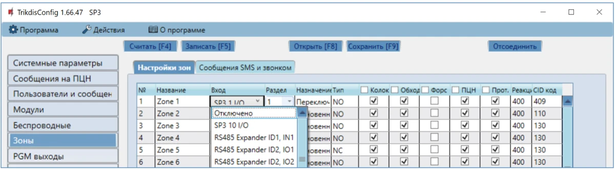 - В закладке "Зоны" сделайте настройки входам расширителя.