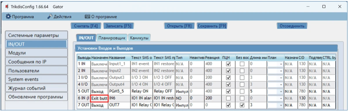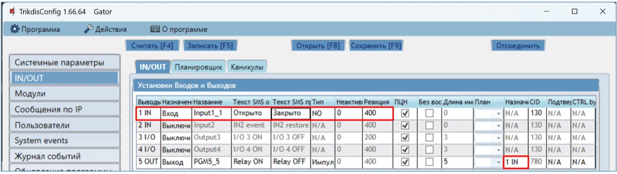 В программе TrikdisConfig в окне „IN/OUT“ необходимо назначить подключенный вход IN1 к выходу OUT, который будет управлять воротами.