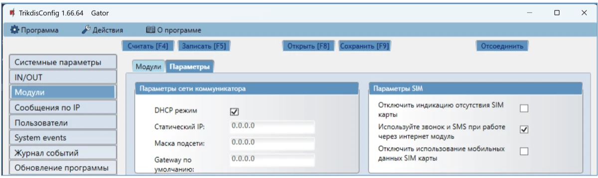 Сделайте необходимые настройки контроллеру. Окончив конфигурацию, нажмите кнопку Записать [F5]. Чтобы отключиться от контроллера, нажмите кнопку „Отсоединить“ и выключите программу TrikdisConfig.