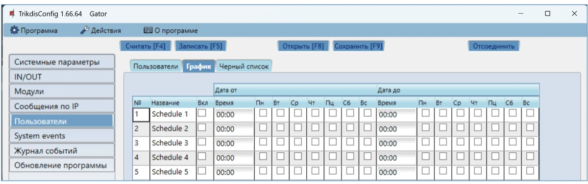Назначить график – пользователю назначается номер временного графика (указываются требуемые номера графиков и его настройки устанавливаются во вкладке „График“), когда пользователь может управлять выходами OUT.