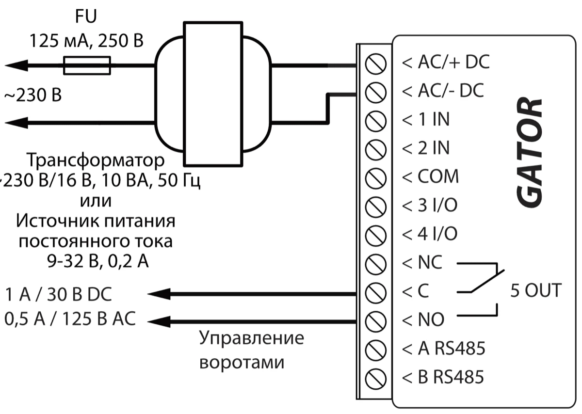 | AC/+DC | Клемма питания (положительная клемма 9-32 В постоянного тока; 12-24 В переменного тока) |