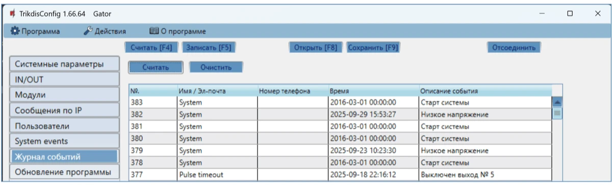 Нажмите кнопку „Считать“. „Журнал событий“ будет считан из памяти контроллера. „Журнал событий“ предоставляет информацию о выполненных действиях контроллером и его внутренних событиях.