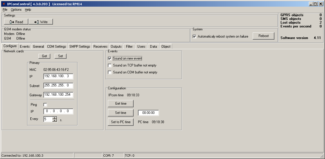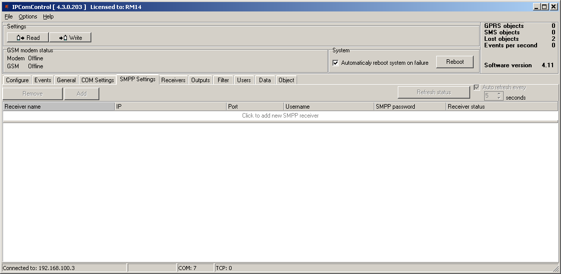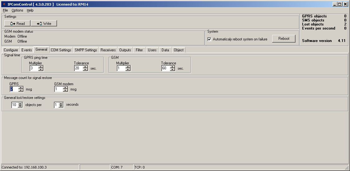 5) Укажите параметры действия и контроля связи (см. раздел «Конфигурирование приёмника» о карточке „General“ и, если SMS сообщения будут приниматься через SMS центр оператора, о карточке„SMPP settings“);