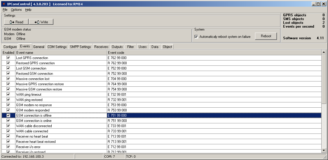 | E751 | GSM connection is offline / Потеряна связь с GSM сетью | 0000 / ID приёмника | 000 | Если с момента запуска программы прошло более 1 мин. и/или приёмник GSM служебным сообщением предупреждает о потере связи с GSM сетью. |