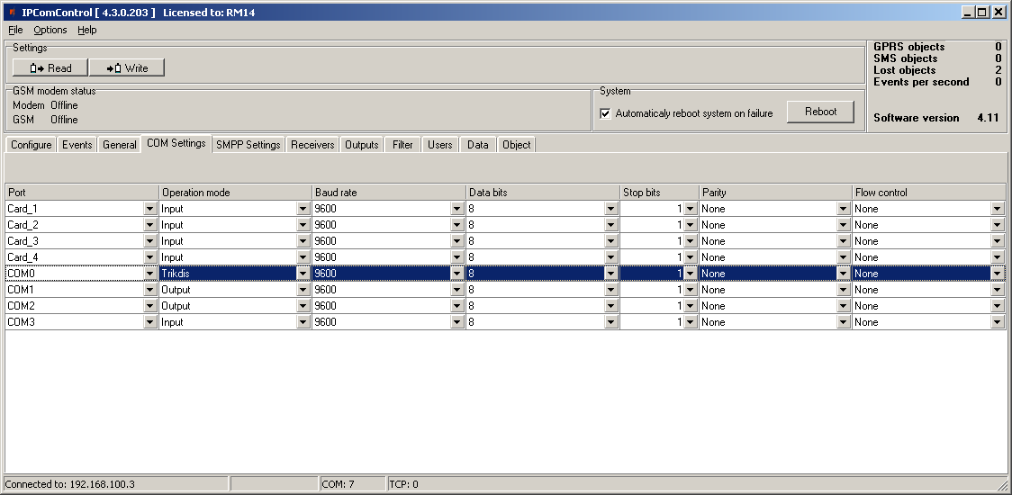 2) Укажите назначения и параметры физических портов приёмника (см. раздел «Конфигурирование приёмника» о карточке „COM settings“);