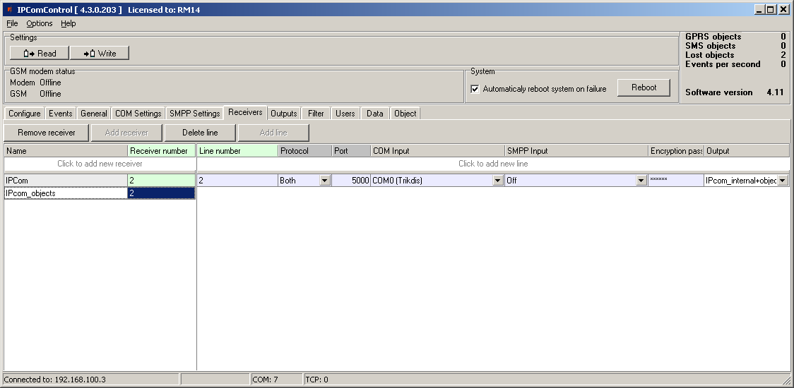 По отмеченному IPCom каналу высылаются внутренние сообщения приёмника, отмеченные в карточке „Events“, которые направляются на указанный канал вывода данных. Для приёма сообщений посылаемых по протоколам TCP/UDP, необходимо создать ещё один канал приёма. Принимаемый по нему поток данных направляется на указанный канал вывода данных.