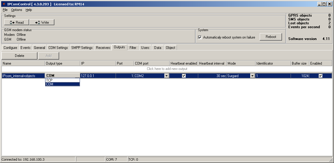 В окошке Output type указывается тип связи с программой наблюдения: TCP или COM;