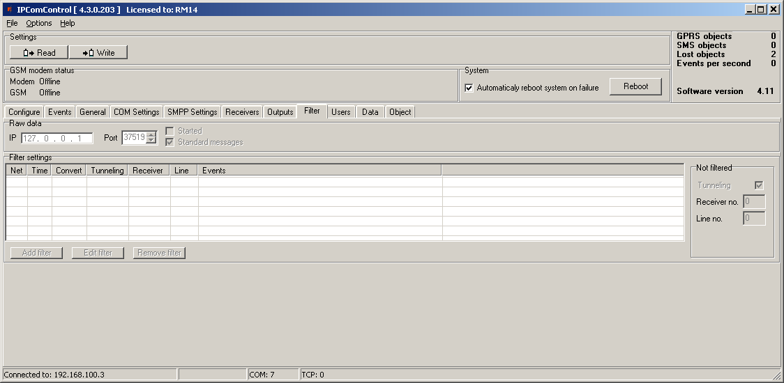 Если в поле Not filtered отмечено окошко Tunneling, сообщения на программу наблюдения будут направлены с номерами приёмкика и линии, указанными в карточке General. Если окошко Tunneling остаётся не отмеченным, сообщения передаются с полученными номерами приёмника и линии.