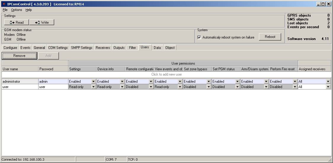 В окошке View events and objects указывается право открывать карточки „Data“ и „Objects“ программы IPcomControl v4;