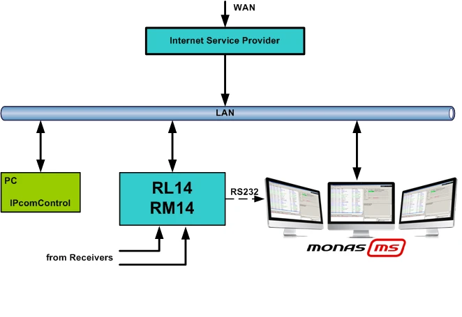 Принятые сообщения приёмник по сети LAN или СОМ портам RS232 направляет на программу наблюдения.