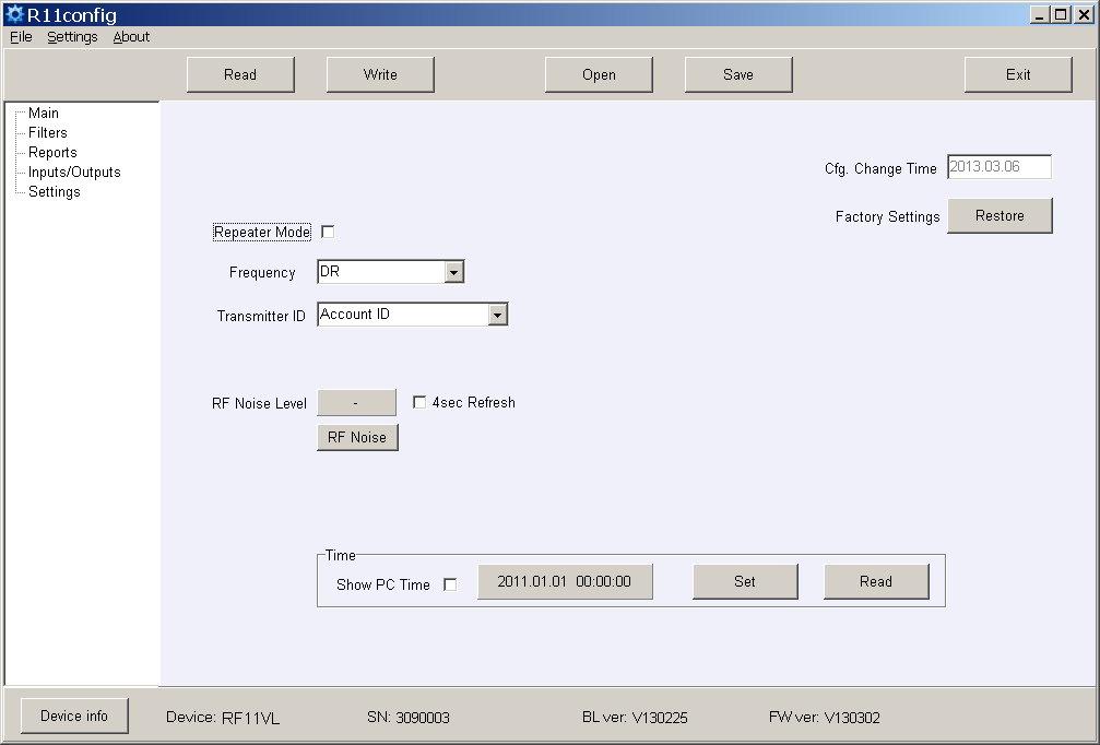 Настройка рабочих параметров выполняется с помощью программы настройки параметров R11config v130226 путём подключения компьютера к приёмнику через USB-кабель. Использование программы и изменение настроек доступны как при включённом внешнем источнике питания, так и при питании через порт USB.