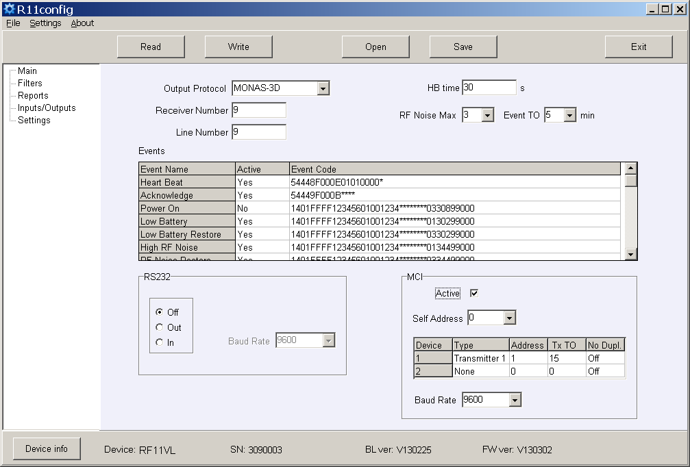 Задайте выходной протокол Out Protocol, номер приёмника Receiver Number и номер линии Line number, время контрольного сигнала HB time и скорость передачи данных Baud Rate для RS232.