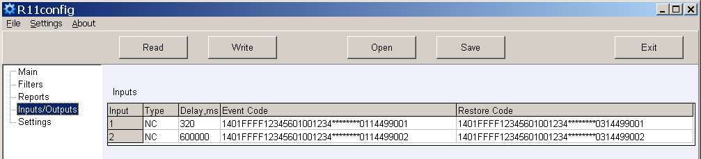 Установите параметры работы входов и коды событий в разделе программы Inputs/Outputs.